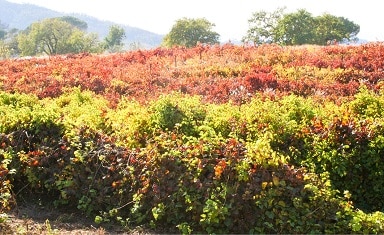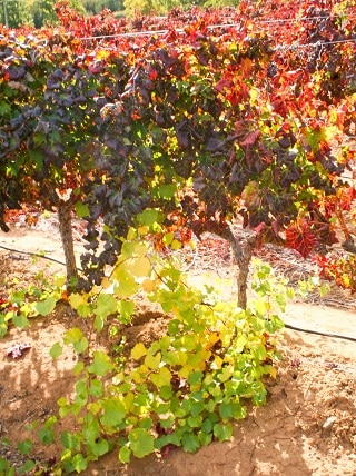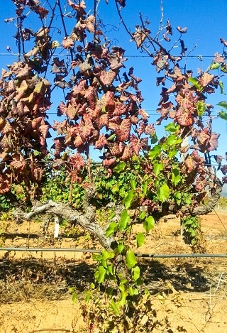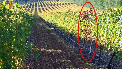 FIGURE 6. Vines were selected where the scion (red cultivars) displayed clear symptoms of grapevine leafroll disease, but where vigorous, lignified Richter 99 rootstocks were present.