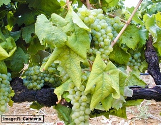 FIGURE 3. Grapevine leafroll disease is difficult to detect in white cultivars. In the picture above, Chardonnay, which is one of the white cultivars that shows the disease best, displays the symptoms which gave grapevine leafroll disease its name.