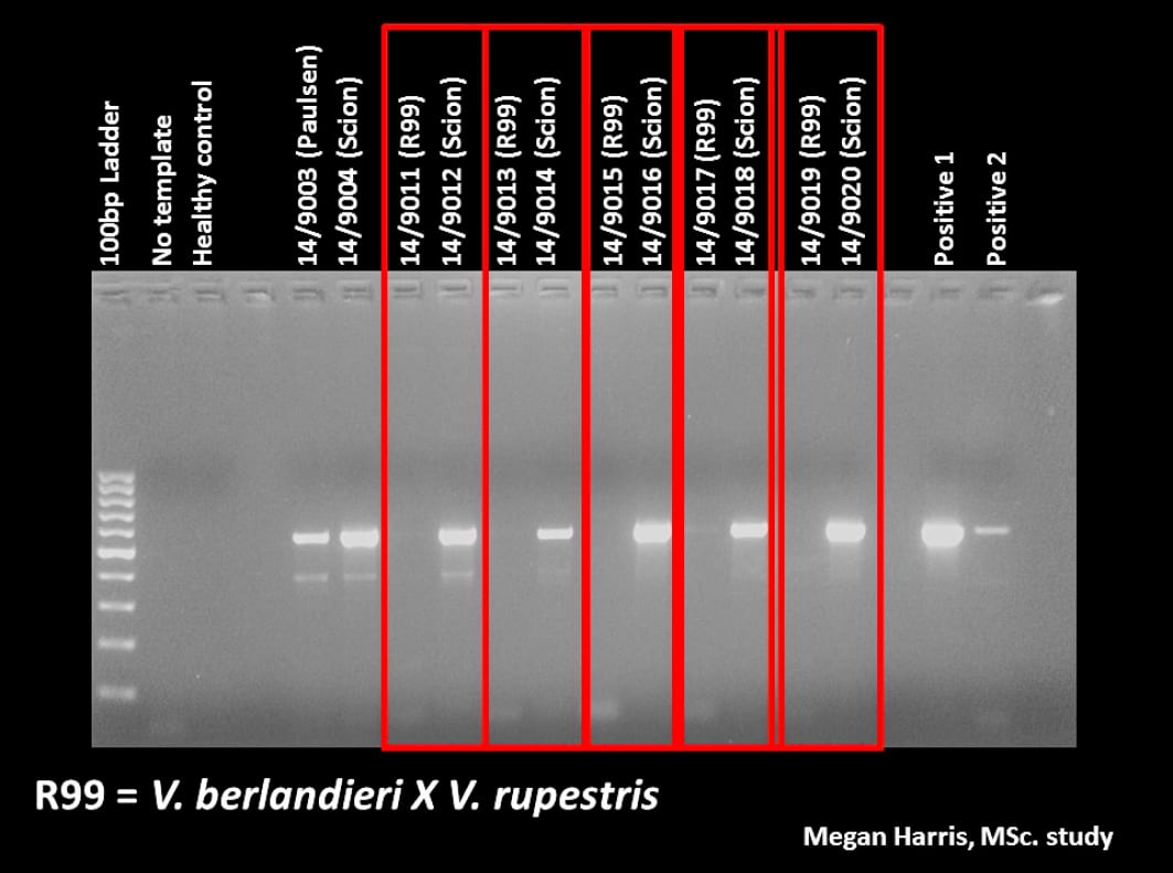 FIGURE 9. Results of a RT-PCR reaction for GLRaV-3 on electrophoresis gel. The presence of the white bands above is clear in the scion of any vine, but not in its corresponding Richter 99 rootstock (each red rectangle represents a single vine).