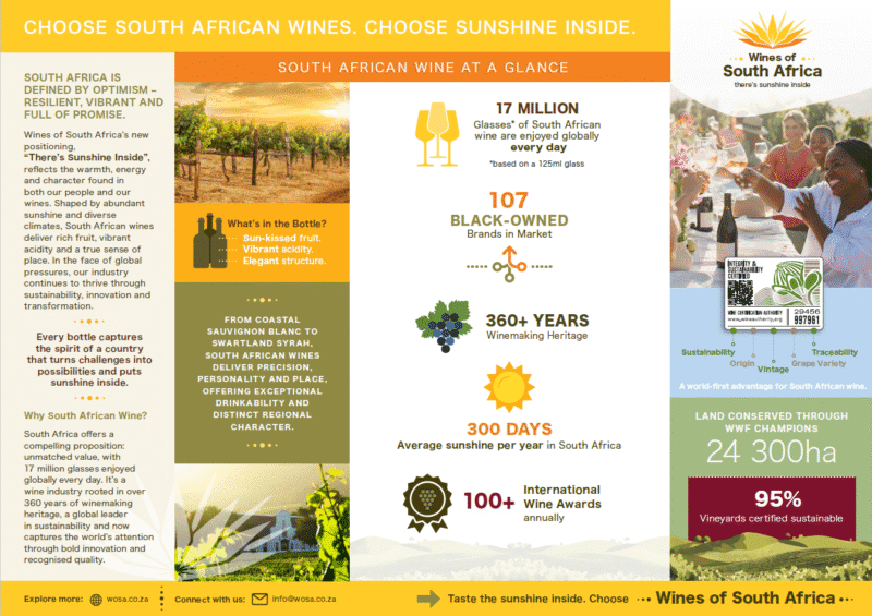 - Market growth and brand positioning, presenting South Africa as the world’s most diverse and authentic wine tourism destination under the tagline Find your sunshine, which highlights the warmth of the people, landscapes, and experiences while complementing WoSA’s There’s sunshine inside export brand.