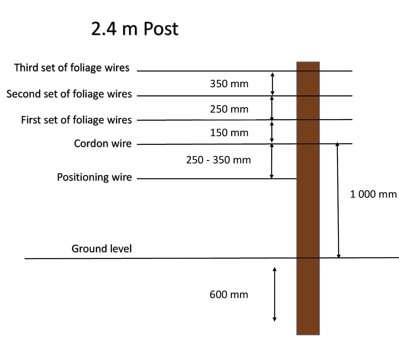 The recommended cordon height for the 2.1 m post is 900 mm and 1 000 mm for the 2.4 m post. If the cordon wire does not go through the middle of the post, but is attached to the side of the post instead, it should preferably be attached to the opposite side of the bending wire. The reason for this is the space left by the thickness of the post for downward bending of shoots.