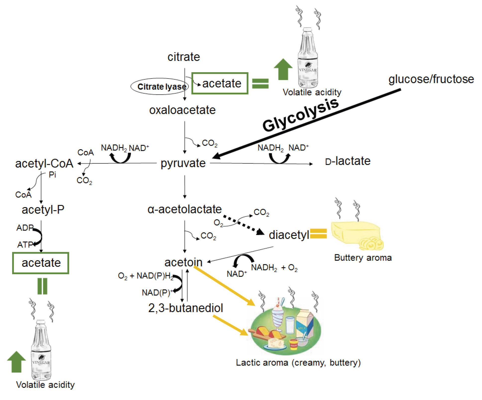 Diacetyl is spontaneously produced during citric acid degradation from α-acetolactate (Figure 1) which is favoured in the presence of oxygen. The degree of aeration during winemaking is important since diacetyl in semi-aerobic conditions can be almost six times higher than in anaerobic conditions.